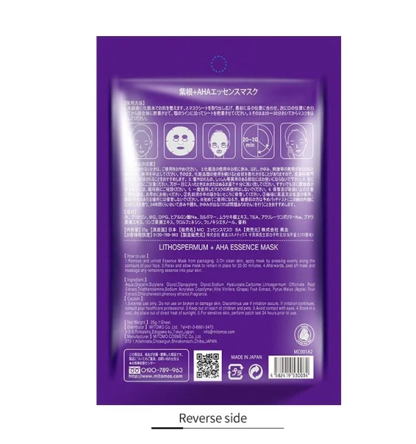 Η AHA & Lithospermum Essence Mask είναι μια πολυτελής ιαπωνική sheet mask που συνδυάζει την ήπια απολέπιση από φυσικά AHA οξέα με τη καταπραϋντική δύναμη του εκχυλίσματος Lithospermum , για λαμπερή, λεία και ισορροπημένη επιδερμίδα.